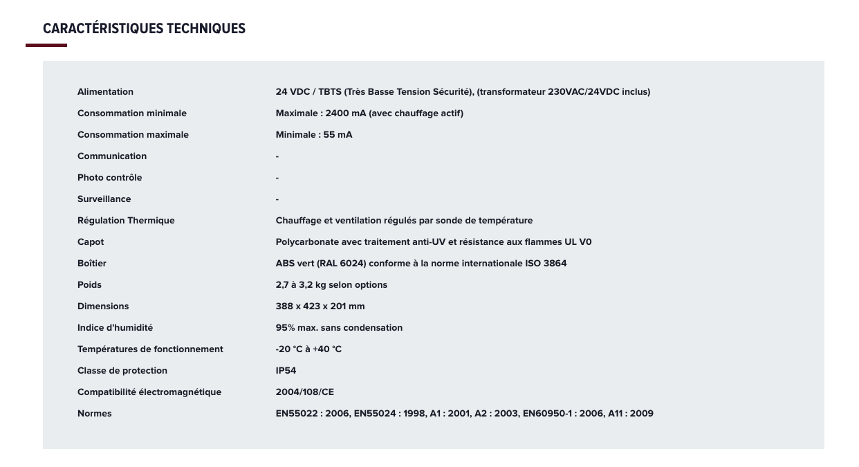 - Armoire alimentée par un transformateur 24 VDC (inclus)